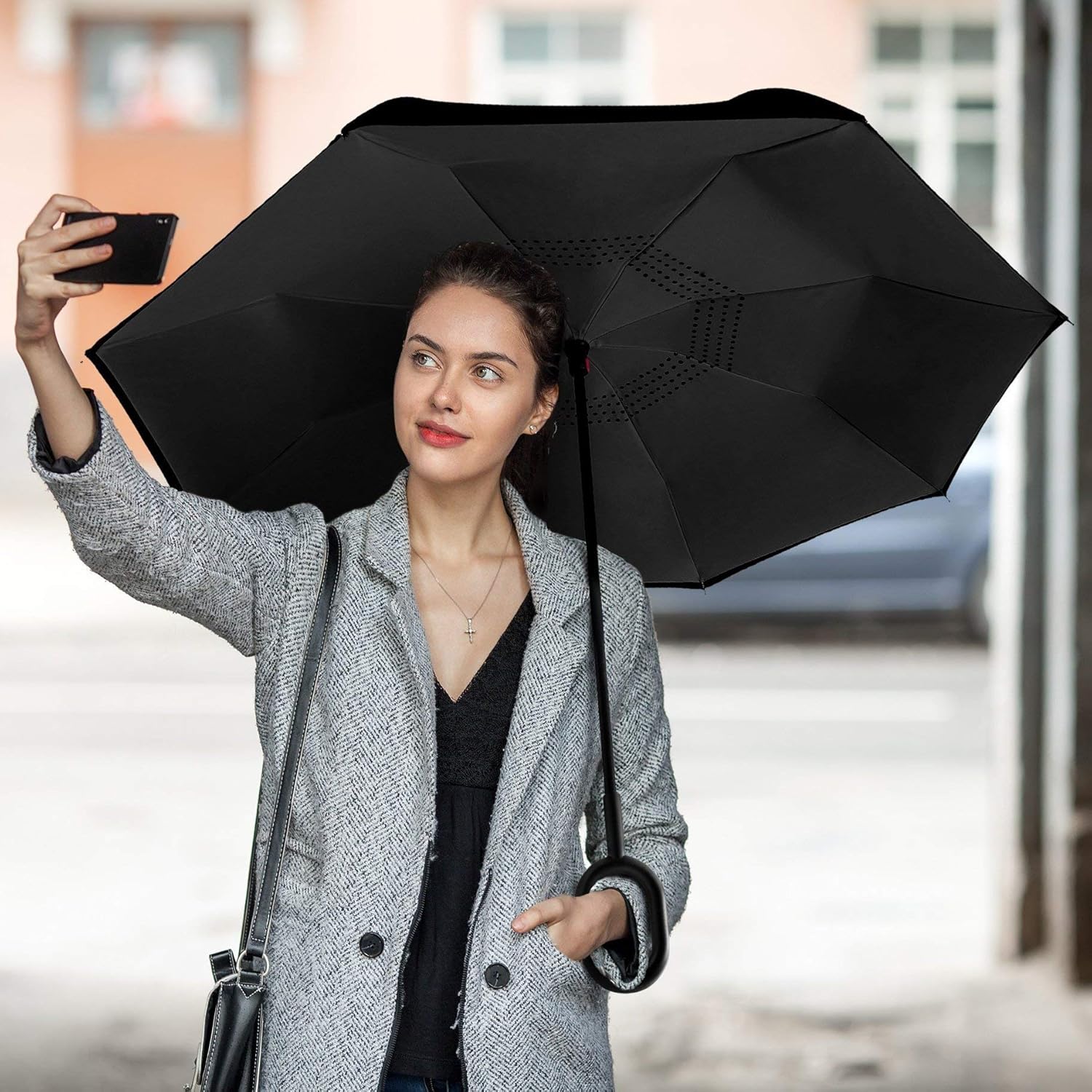 HomeFast Double Layer Inverted Reversible No Drip Umbrella with C-Shape Han...