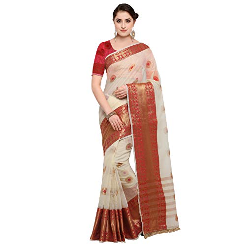 Pisara Women Banarasi Cotton Silk Saree With Blouse Piece,Off-white & Red s...