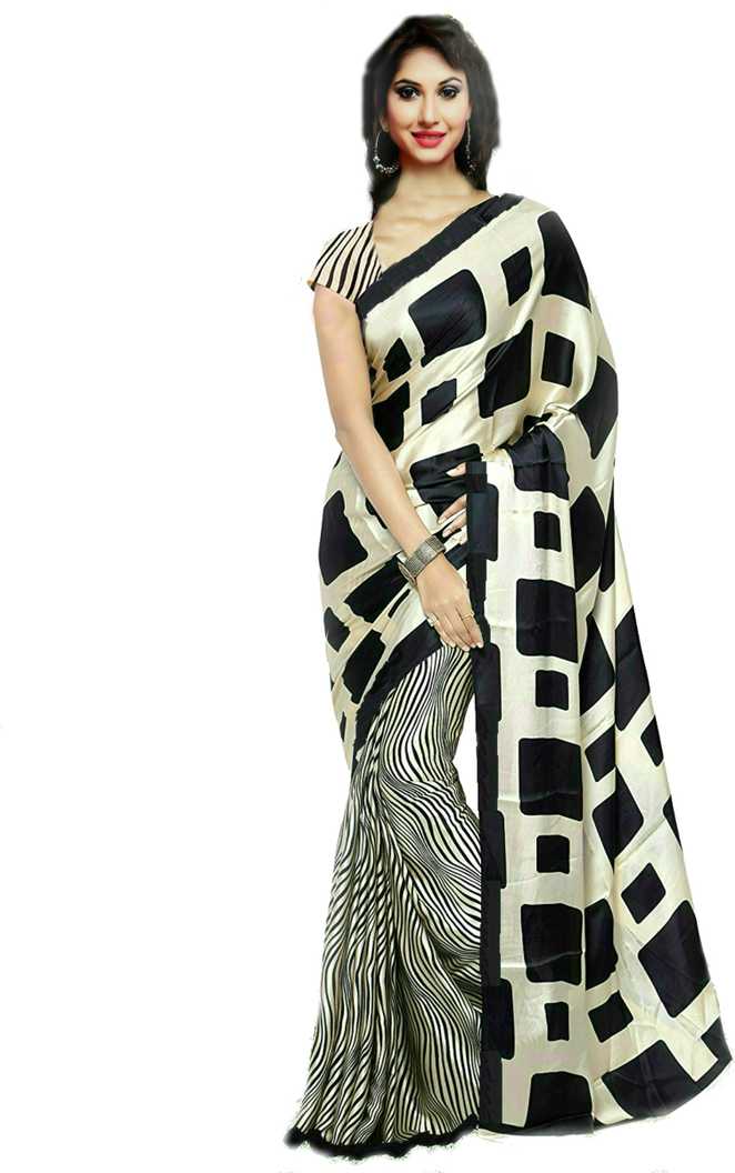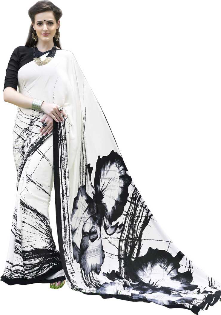 Geometric Print Fashion Poly Crepe Saree (White, Black)