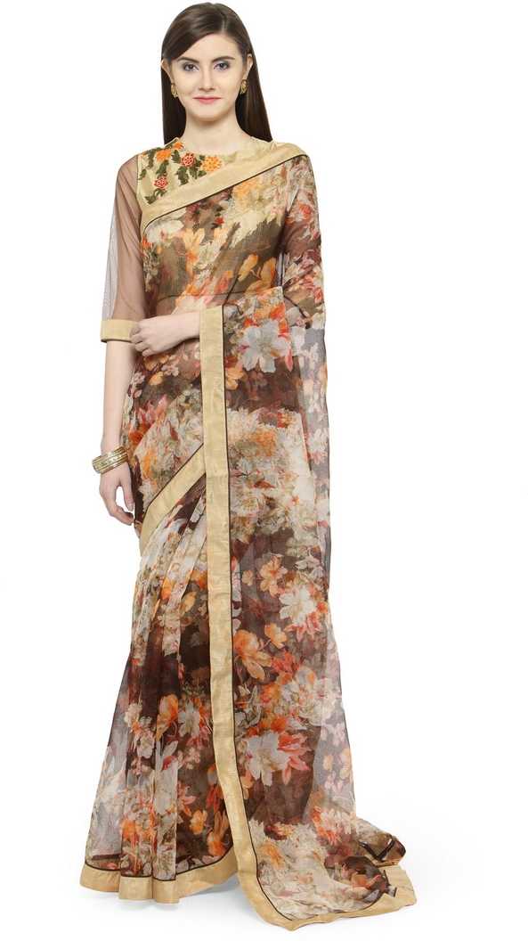 Floral Print Fashion Cotton Blend Saree (Brown)
