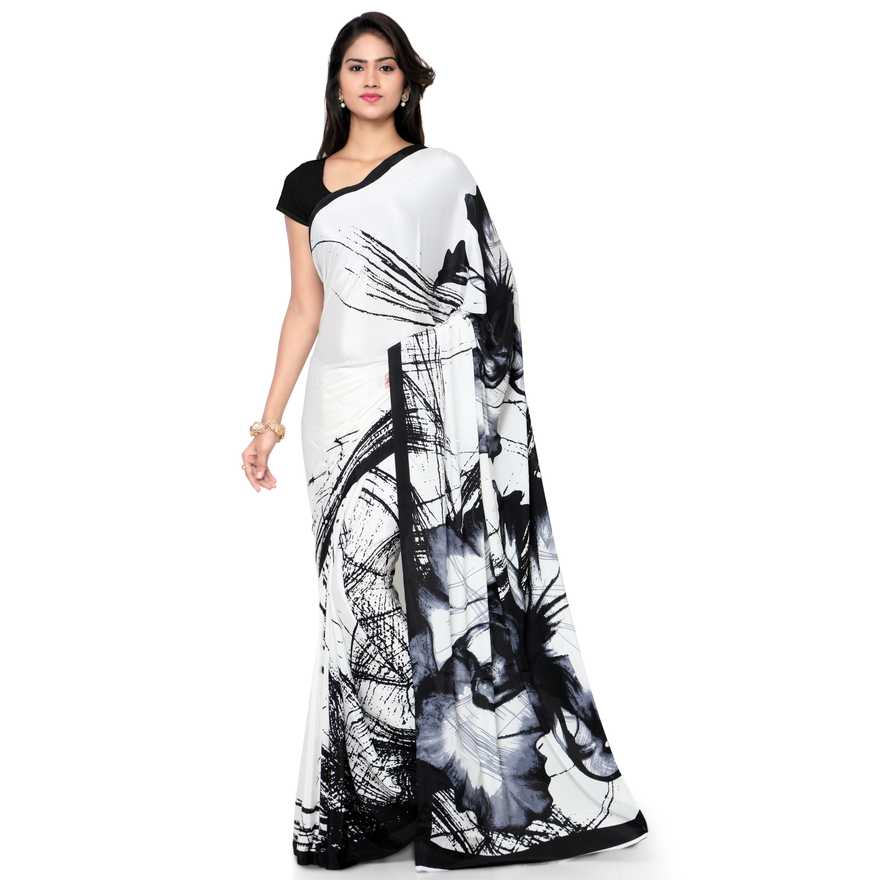 Graphic Print, Digital Print Fashion Poly Crepe Saree (Black, White)