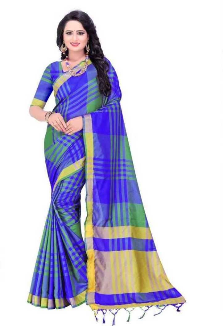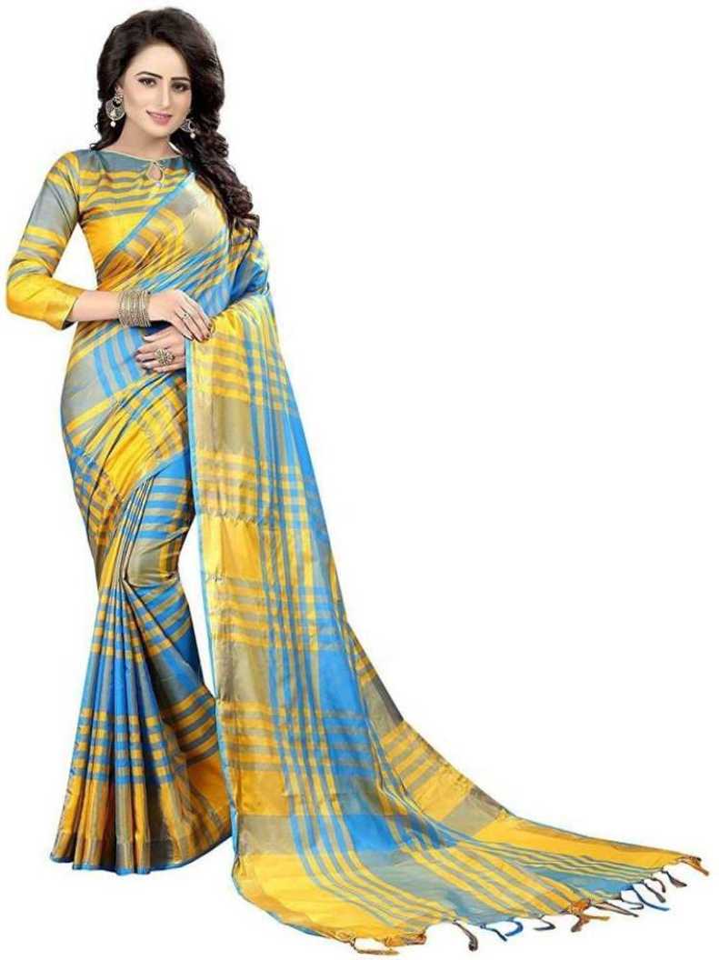 Checkered Fashion Poly Silk, Cotton Saree (Yellow, Blue)