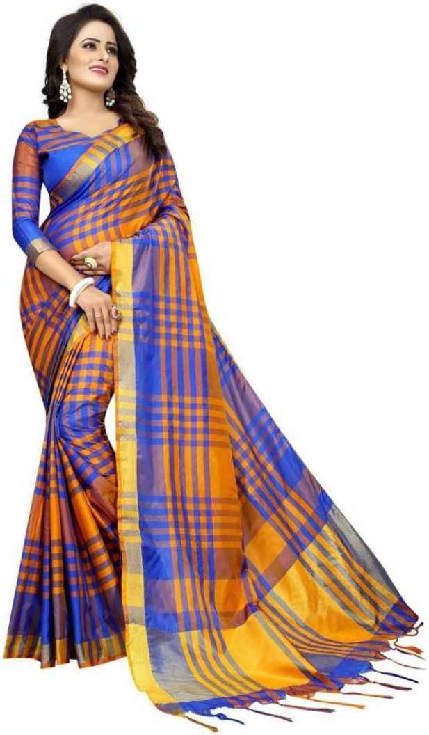 Checkered Fashion Poly Silk, Cotton Saree (Orange, Blue)