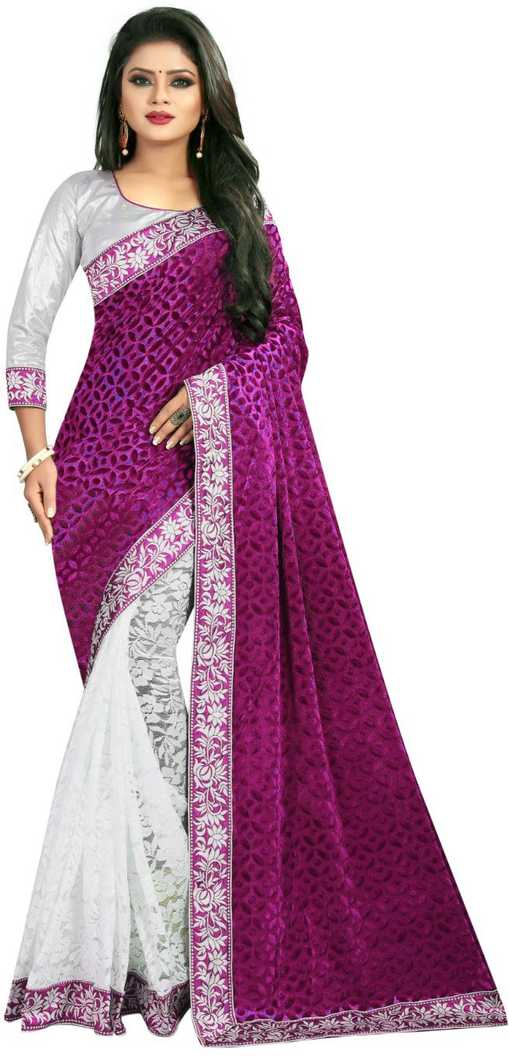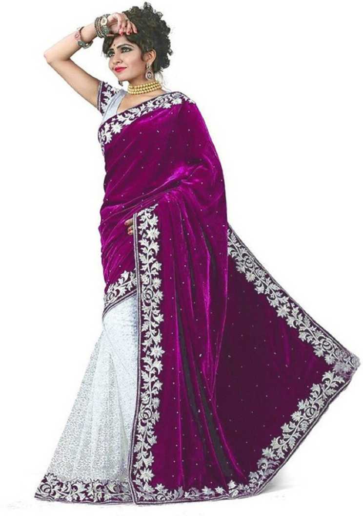 Solid Fashion Net, Velvet Saree (Purple, White)
