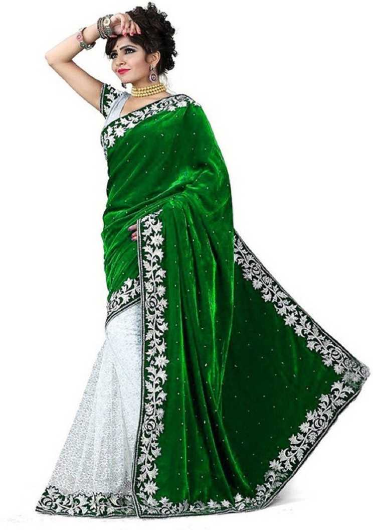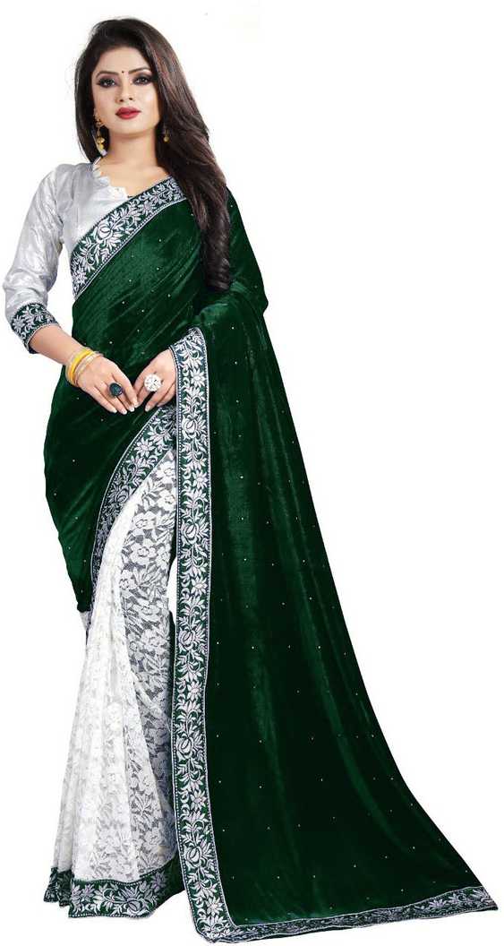 Solid Fashion Net, Velvet Saree (Dark Green)
