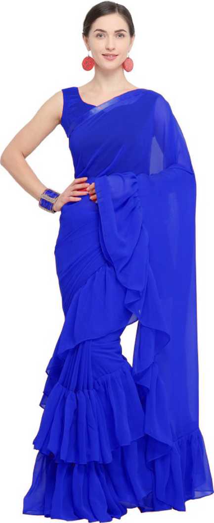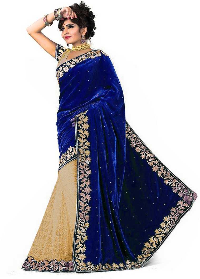 Solid Fashion Net, Velvet Saree (Blue, Cream)
