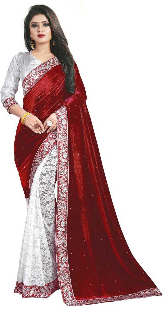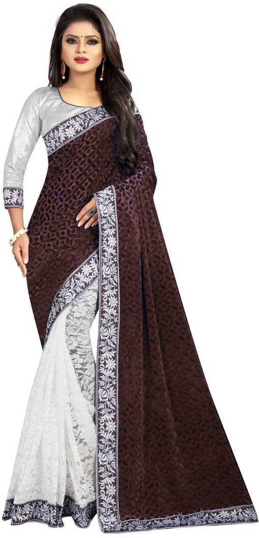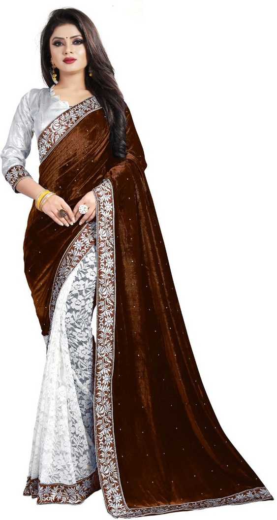 Solid Fashion Net, Velvet Saree (Brown, White)