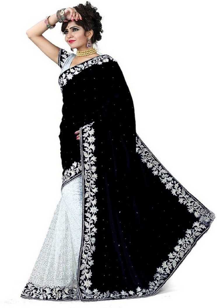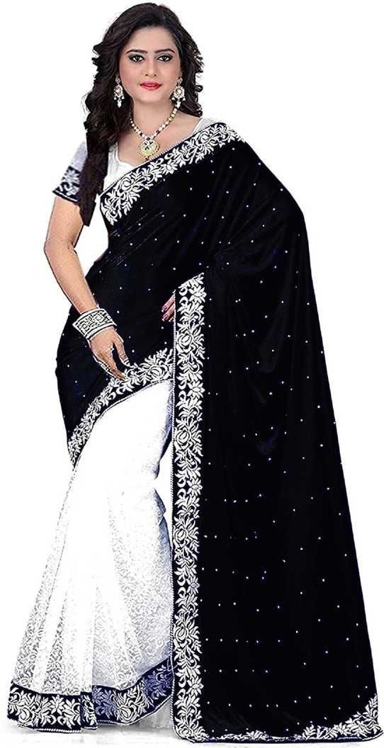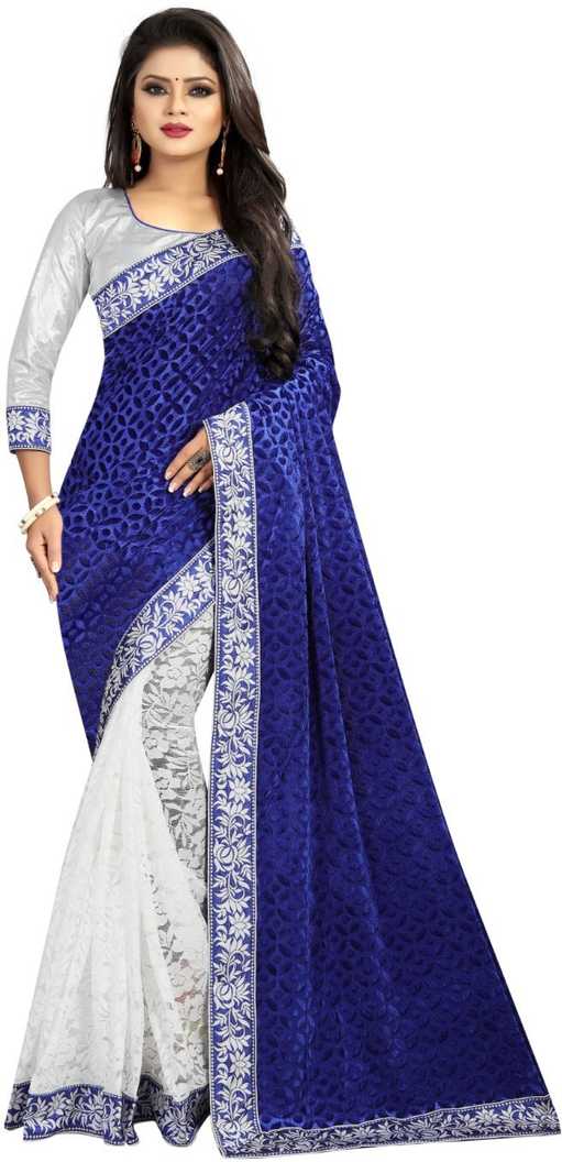 Solid Fashion Net, Velvet Saree (Blue, White)