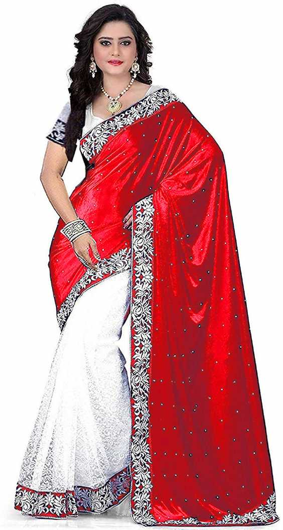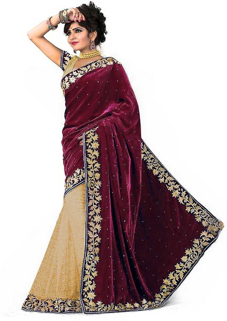 Solid Fashion Net, Velvet Saree (Maroon, Cream)