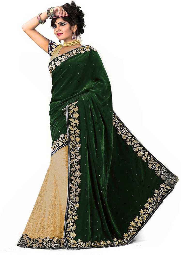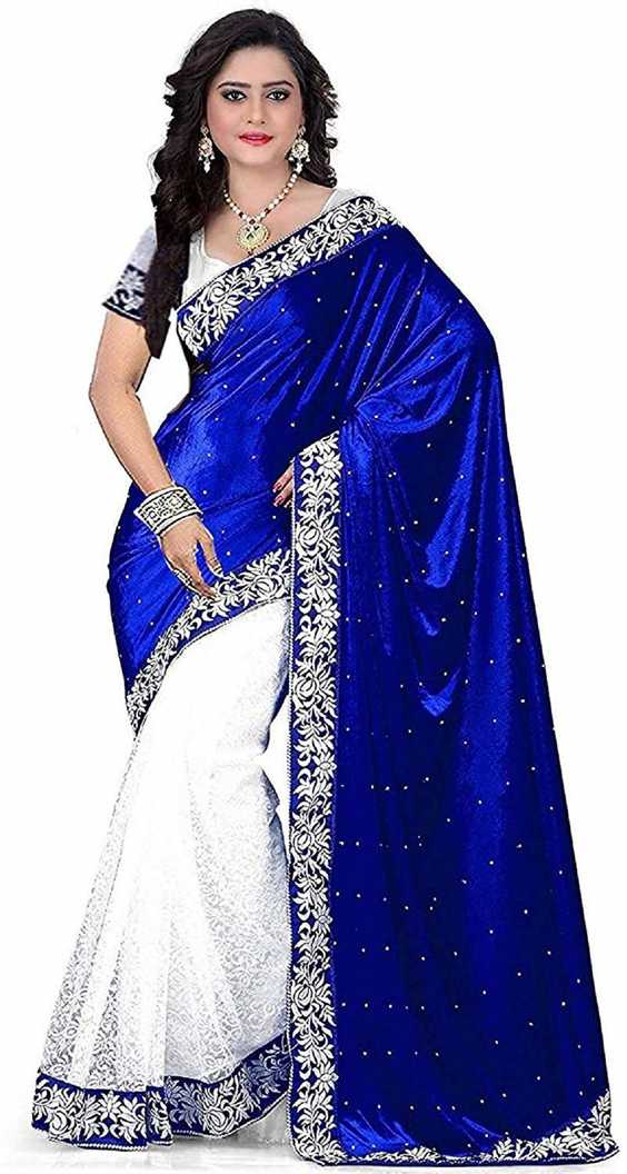 Solid Fashion Net, Velvet Saree (Blue, White)