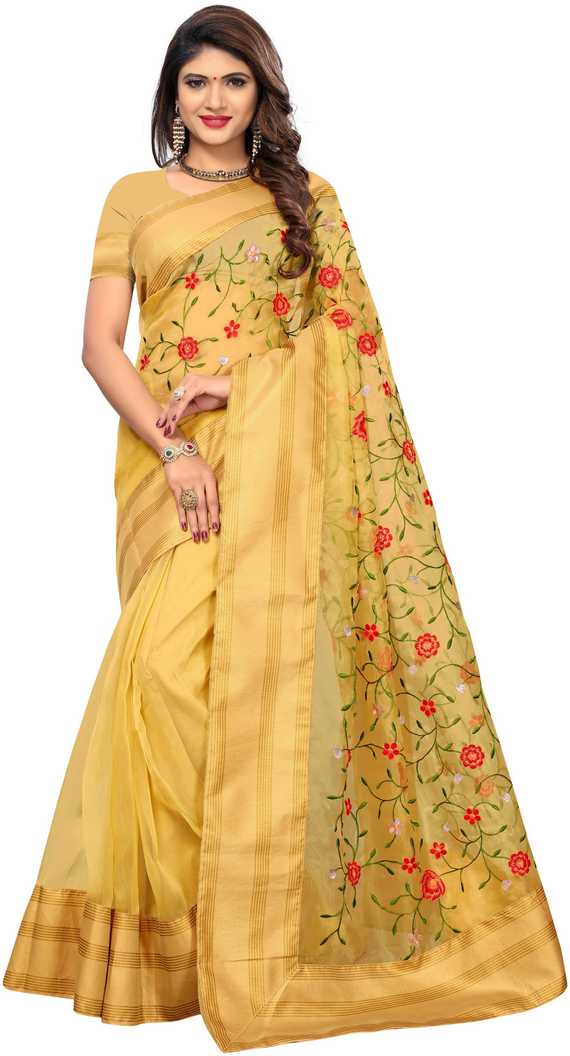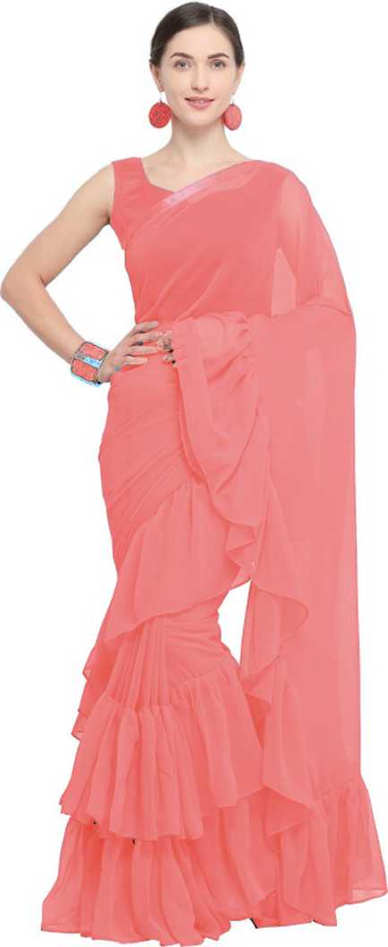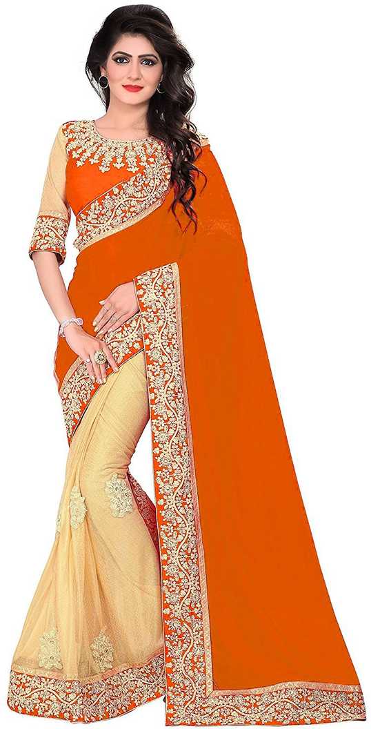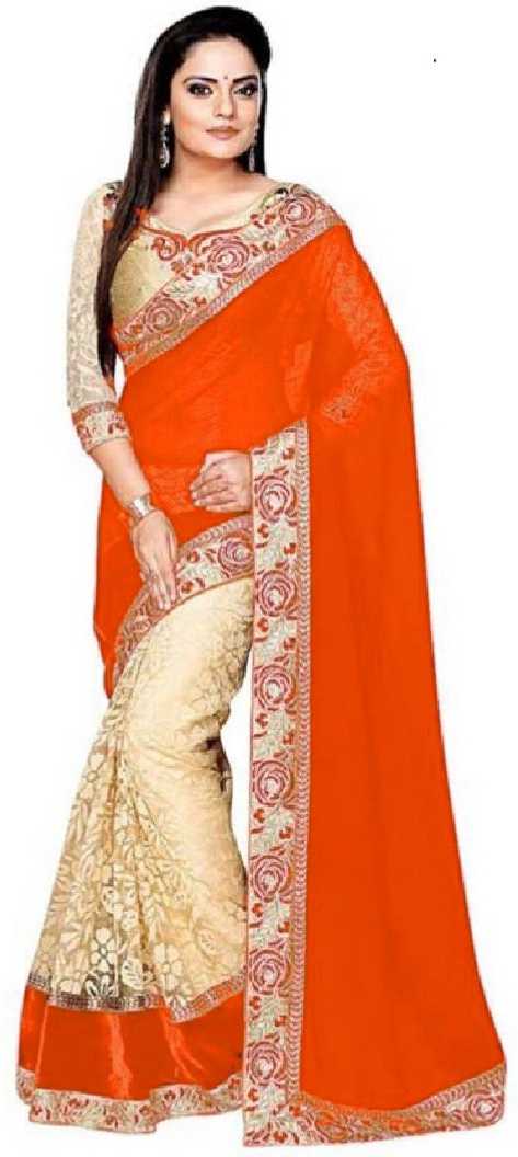 Applique, Self Design Bollywood Poly Georgette, Cotton Blend Saree (Orange...
