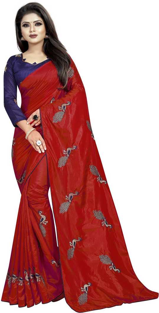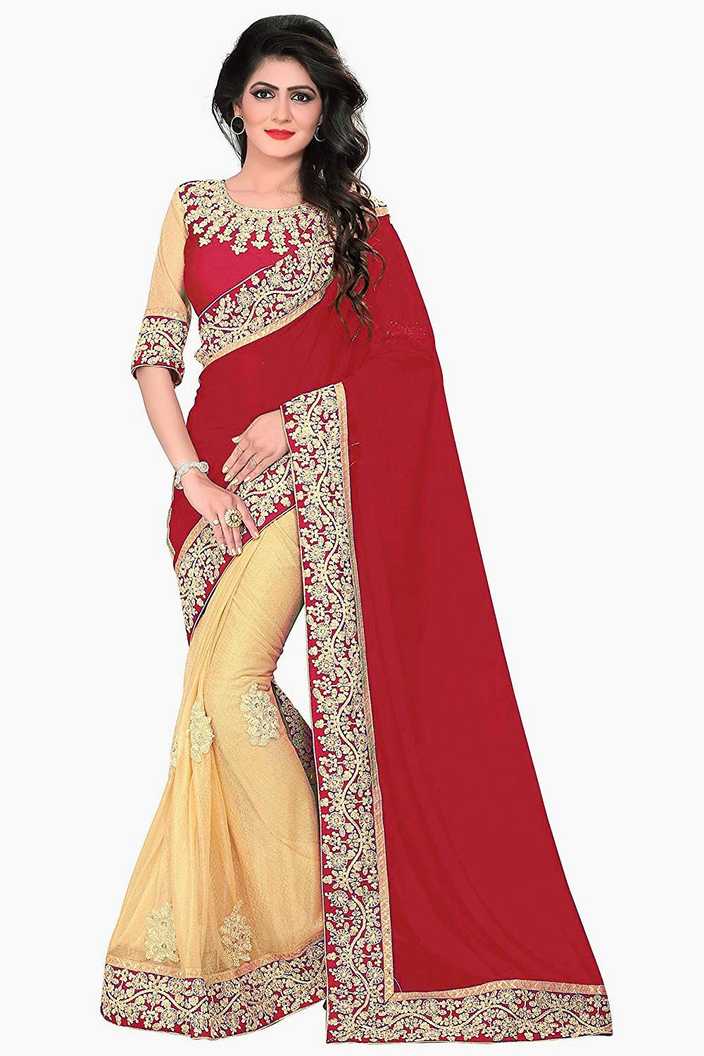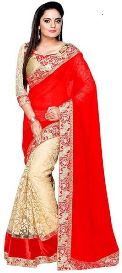 Applique, Self Design Bollywood Poly Georgette, Cotton Blend Saree (Red, C...