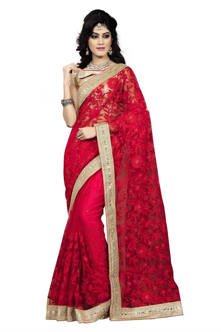 FabTag - BAPS Embellished Chanderi Cotton Blend Saree (Red, Gold)