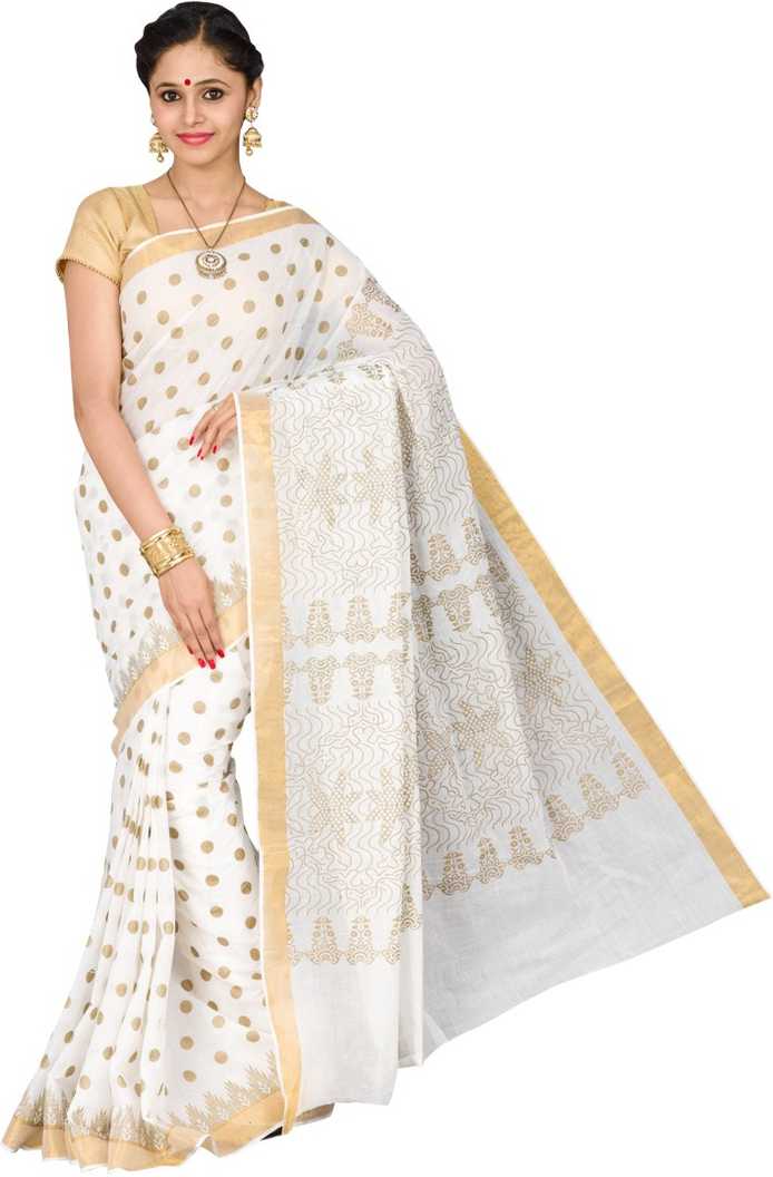 Printed, Self Design Mangalagiri Silk Cotton Blend Saree (White)
