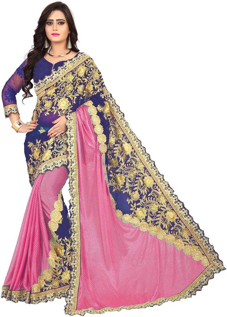 Embroidered Fashion Poly Georgette Saree (Pink, Blue)