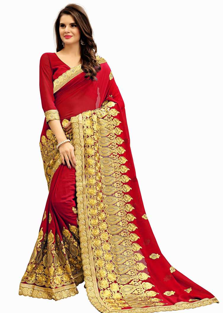 Embroidered Fashion Poly Georgette Saree (Red)