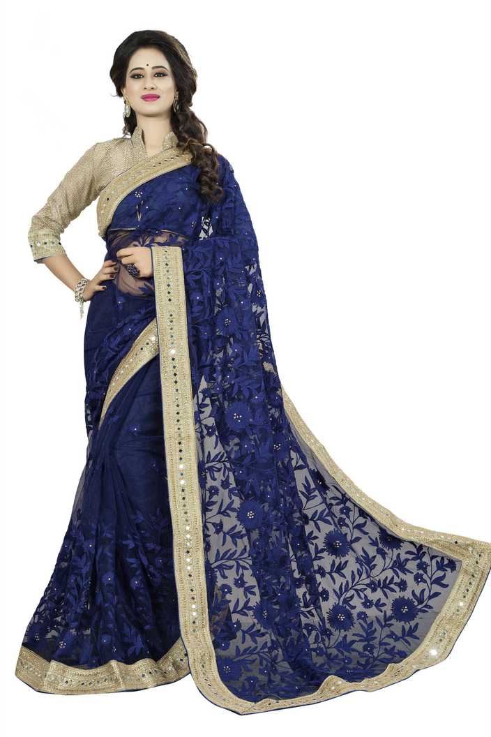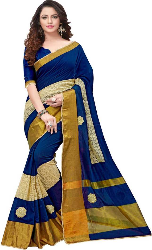 Embroidered, Embellished Fashion Cotton Blend Saree (Dark Blue)