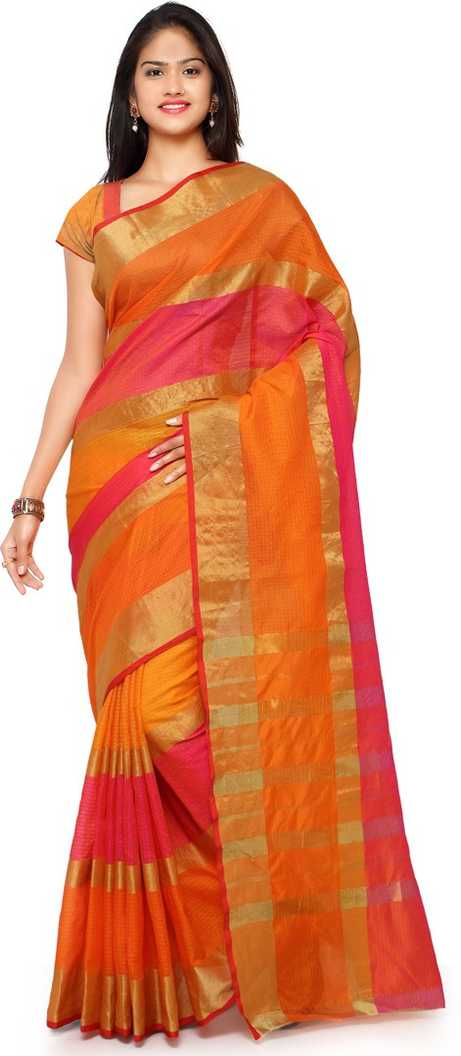 Striped Manipuri Cotton Blend, Poly Silk Saree (Orange)