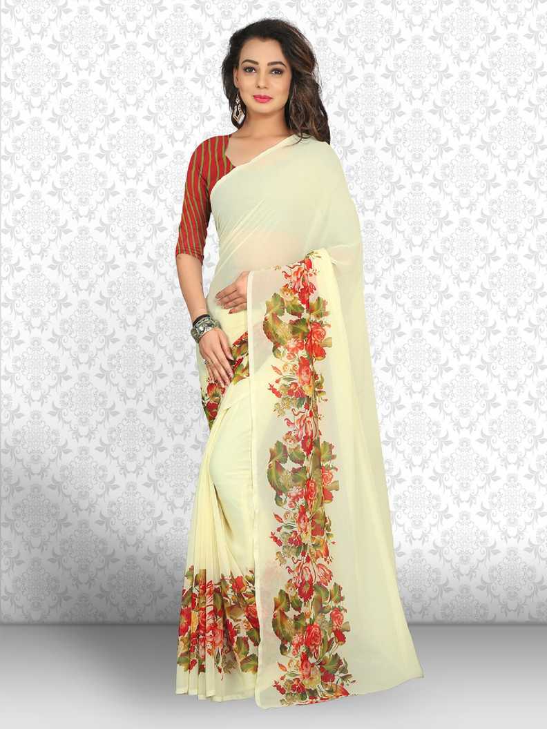 Floral Print Fashion Poly Georgette Saree (Cream)
