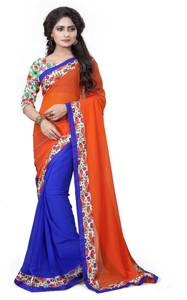 Floral Print Bollywood Poly Georgette Saree (Blue, Orange)