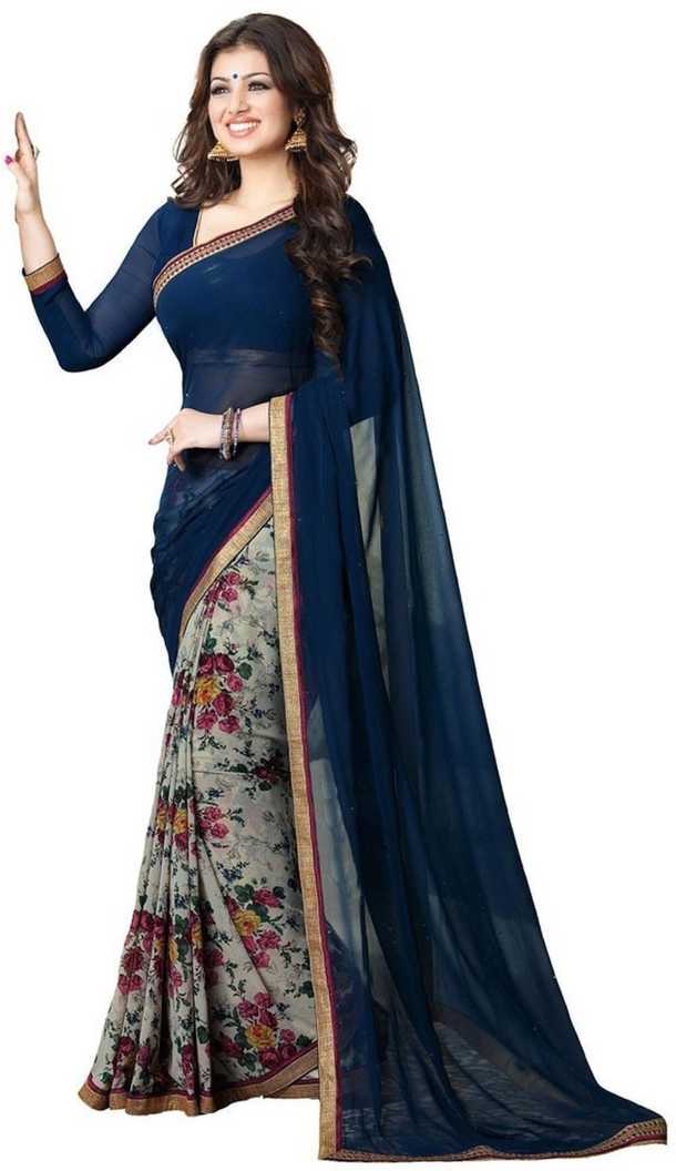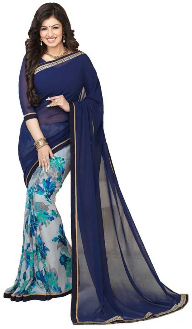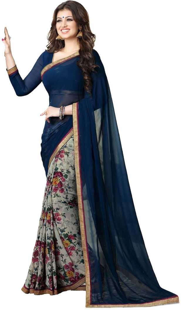 Floral Print Fashion Chiffon Saree (Dark Blue)