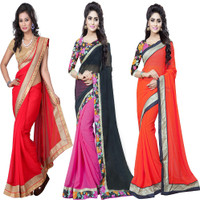 Aai Shree Khodiyar Art Solid Bollywood Georgette Saree(Pack of 3, Multicolo...