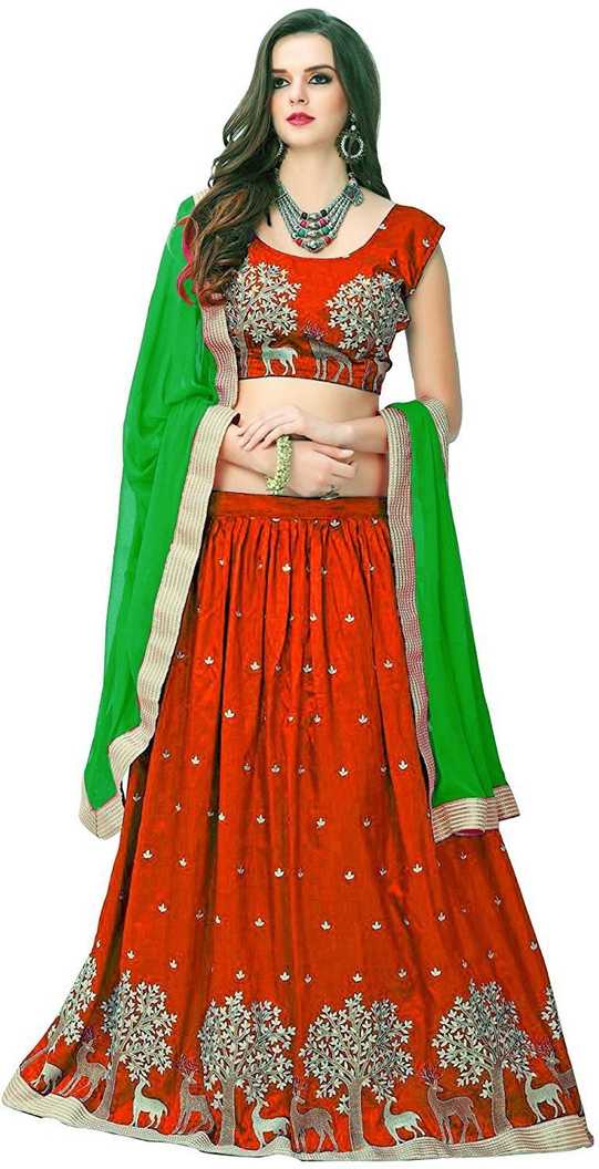 Embroidered Semi Stitched Lehenga, Choli and Dupatta Set (Orange, Green)