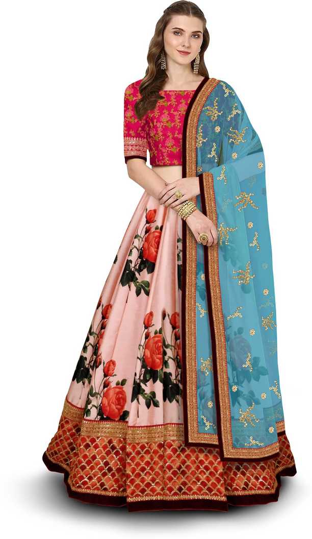 Floral Print Semi Stitched Lehenga, Choli and Dupatta Set (Pink)
