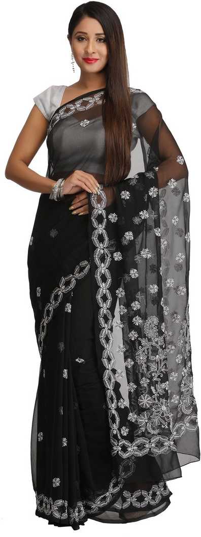 Embroidered Lucknow Chikankari Handloom Georgette Saree (Black)
