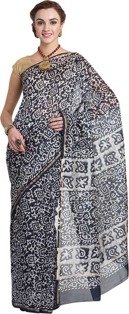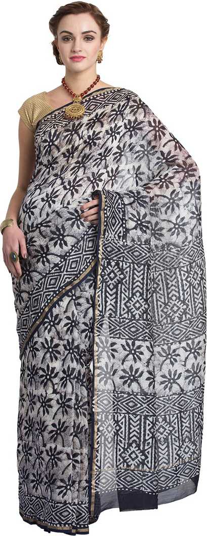 Floral Print Chanderi Cotton Blend Saree (Black, White)
