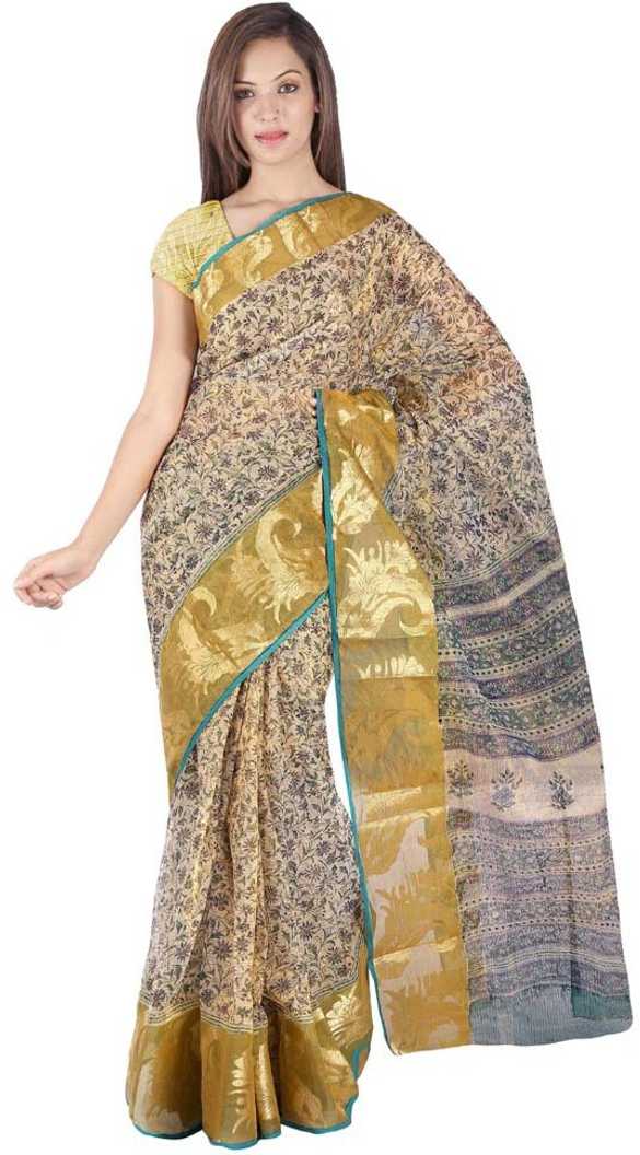 Floral Print Daily Wear Handloom Cotton Blend Saree (White)