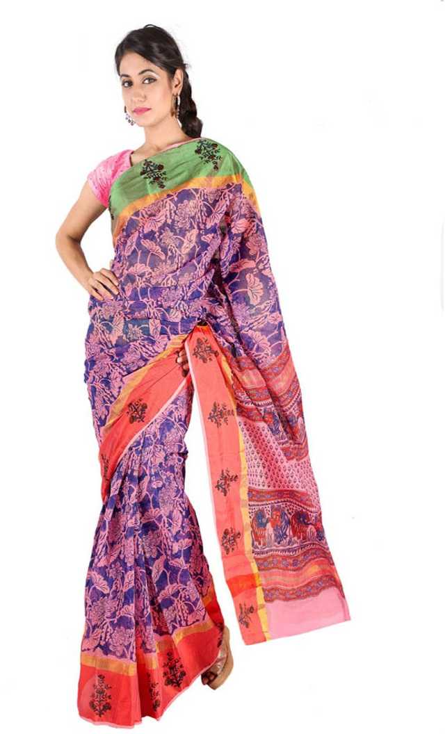 Floral Print Daily Wear Handloom Cotton Blend Saree (Pink)