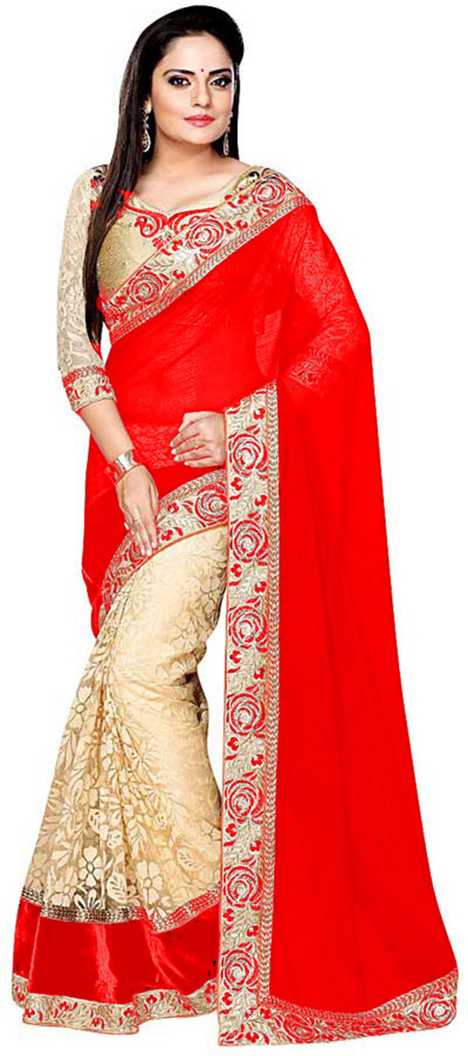 Embellished Bollywood Poly Georgette, Cotton Blend Saree (Red)