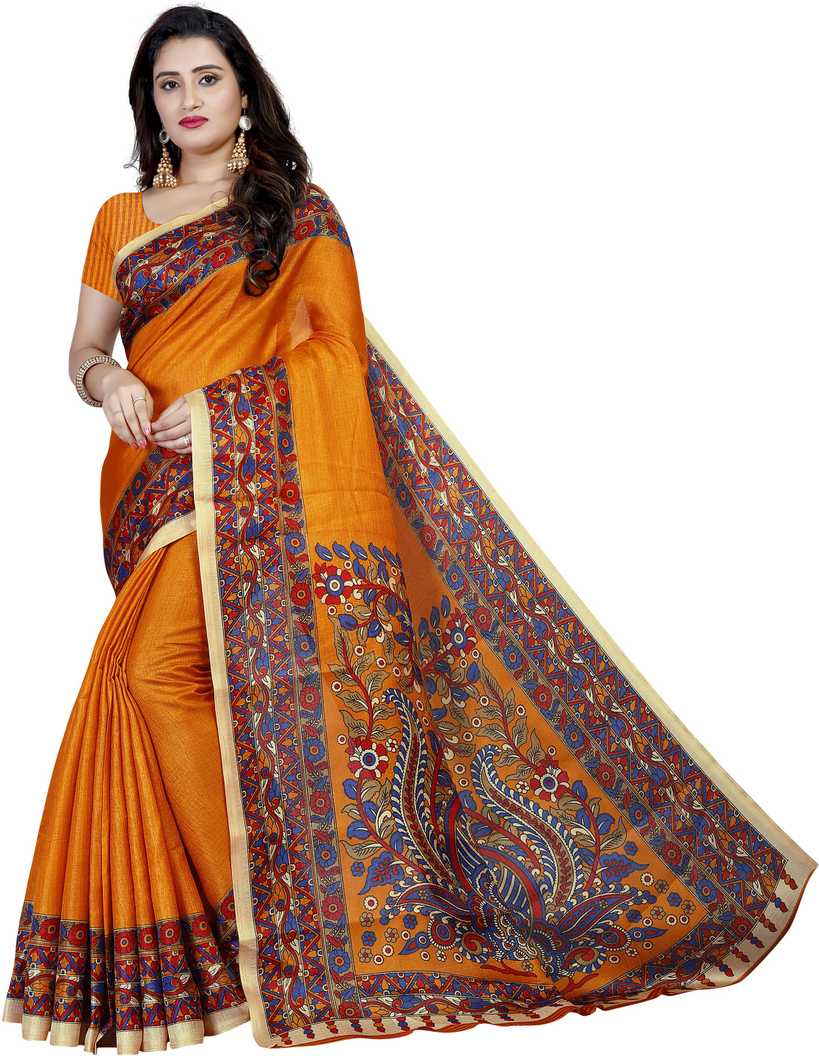 Printed Kalamkari Cotton Blend Saree (Orange)