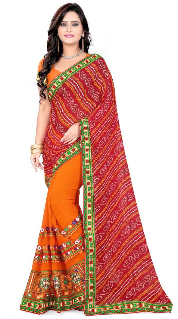 Embroidered, Embellished Bandhej Poly Georgette Saree (Orange)