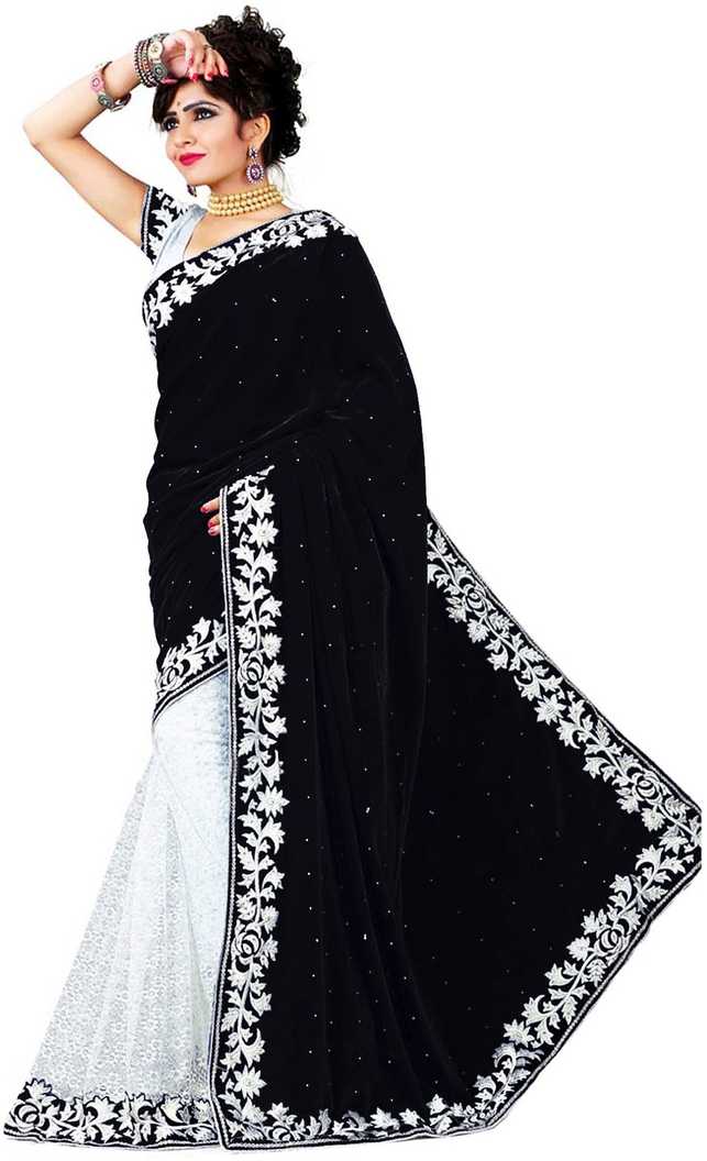 Embellished Daily Wear Velvet, Cotton Blend, Net Saree (White, Black)