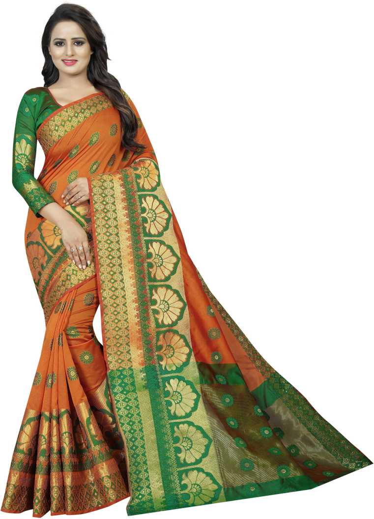 Woven, Solid Kanjivaram Cotton Silk Saree (Pack of 2, Green, Pink, Blue, P...
