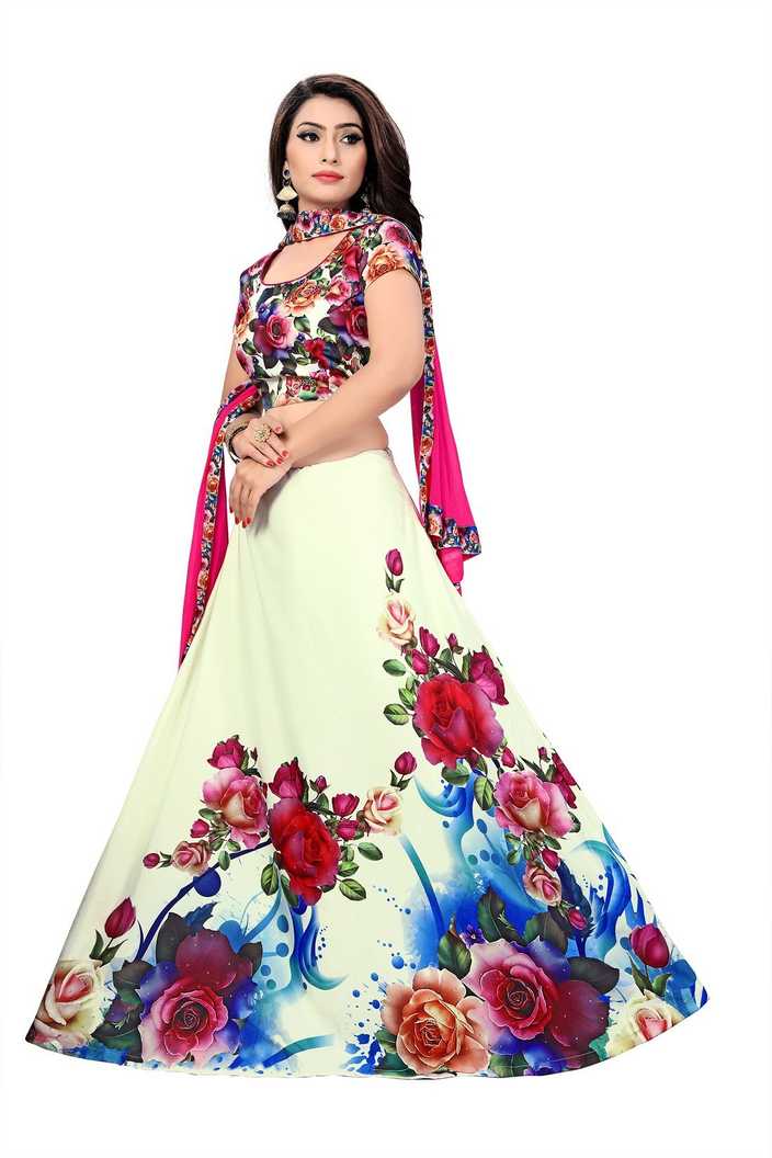 Digital Print Semi Stitched Lehenga, Choli and Dupatta Set (White)