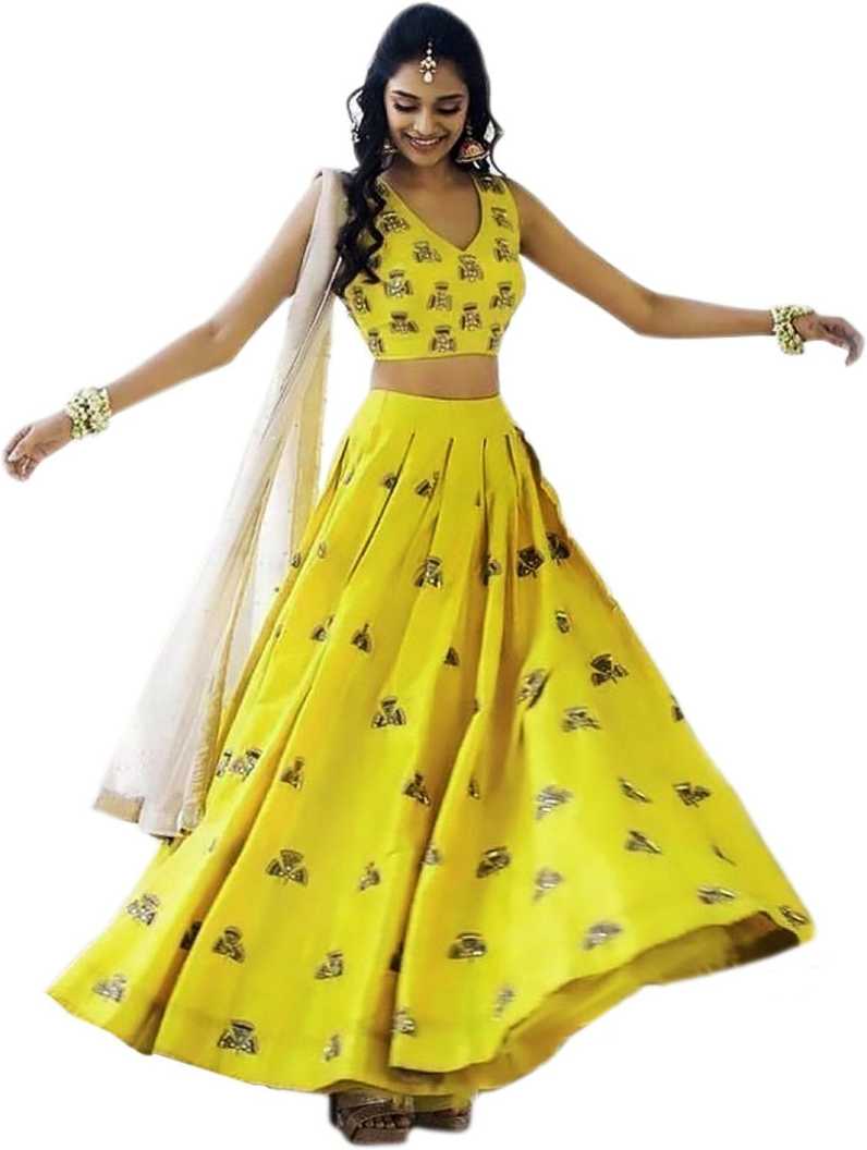 Embroidered Semi Stitched Lehenga, Choli and Dupatta Set (Yellow)