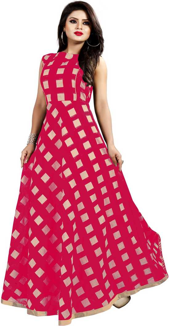 Checkered, Printed, Polka Print Poly Crepe Flared Gown (Pink)