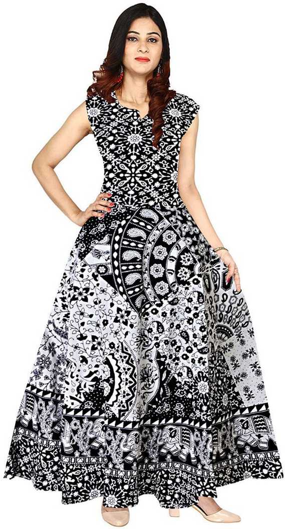 Printed Cotton Blend Anarkali Gown (Black, White)
