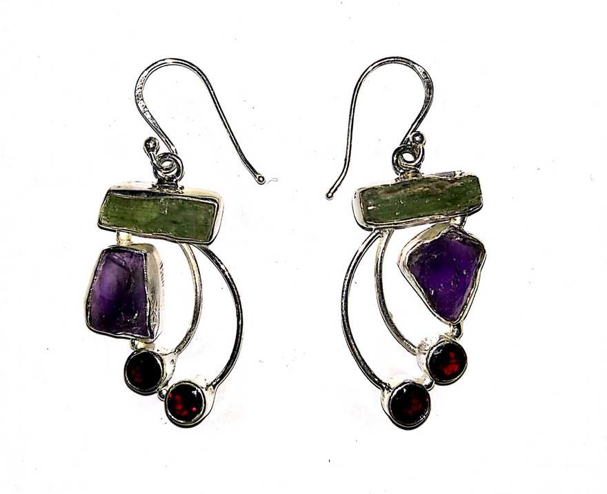 pure silver earrings studded with tourmaline garnet & rough of prehnite gem...