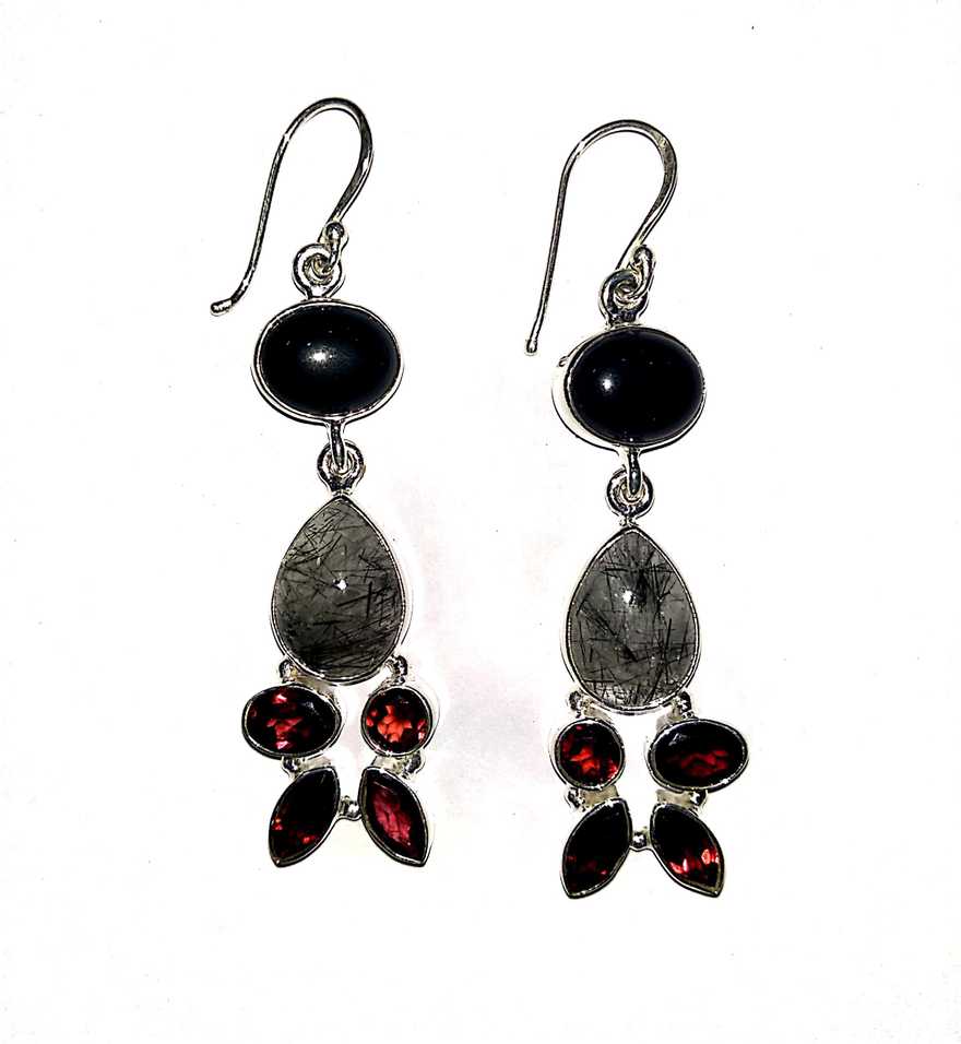 pure silver earrings studded with rutile black onyx & garnet gemstone for g...