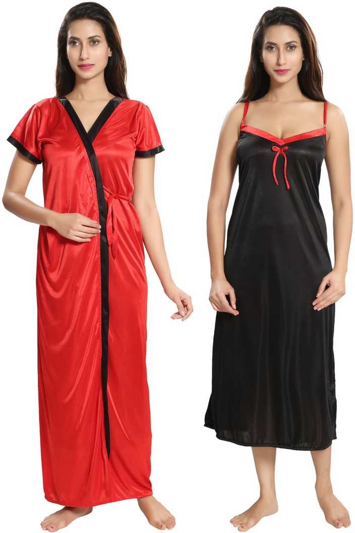 Women Nighty with Robe (Black, Red)