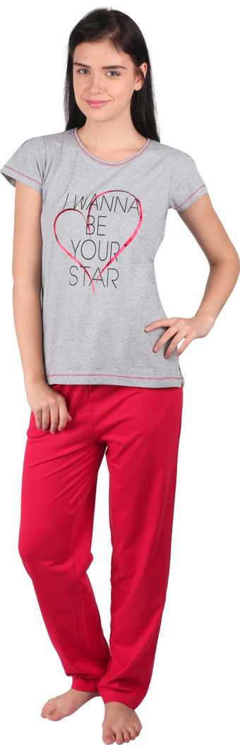 Women Printed Grey, Red Top & Pyjama Set