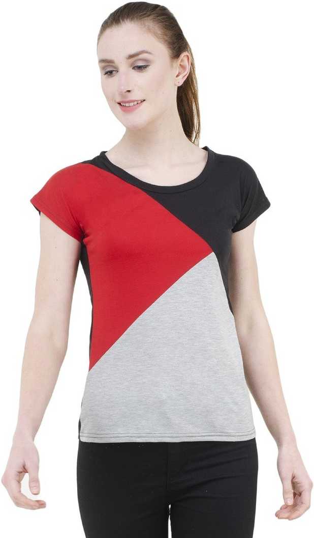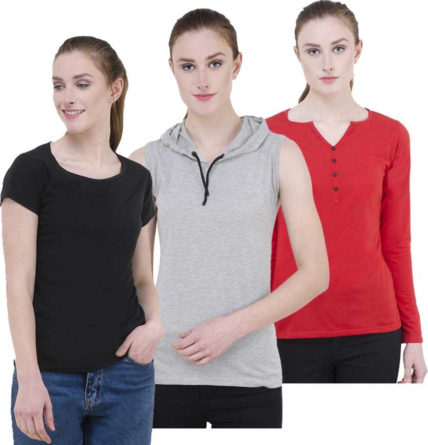 Lime Solid Women Round Neck Grey, Red T-Shirt (Pack of 3)