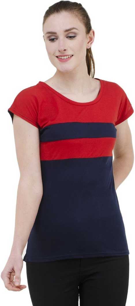 Lime Solid Women Round Neck Dark Blue, Red T-Shirt