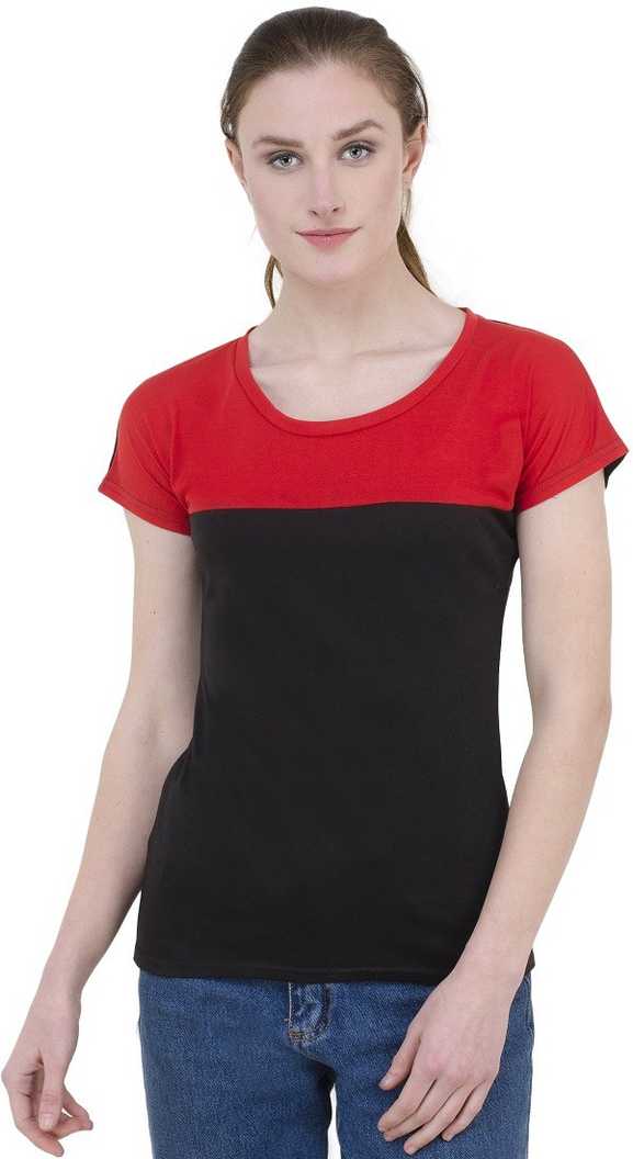 Lime Solid Women Round Neck Black, Red T-Shirt