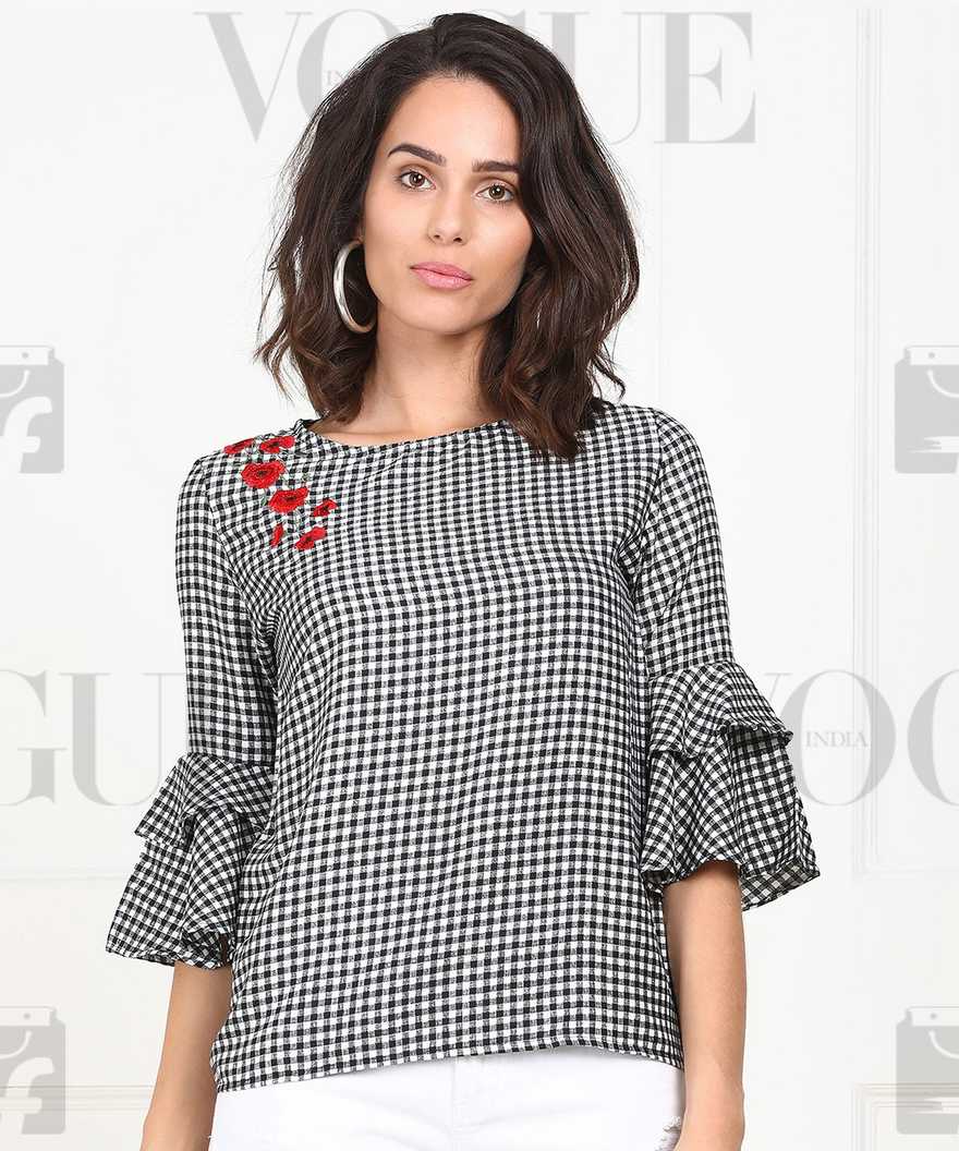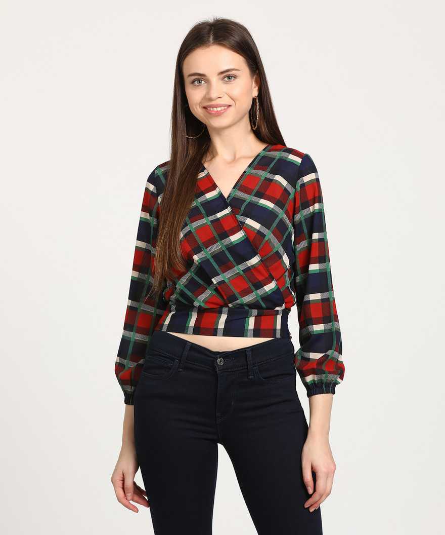 Casual Puff Sleeve Checkered Women's Multicolor Top