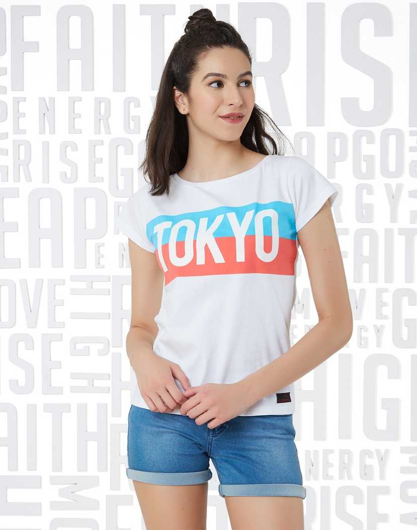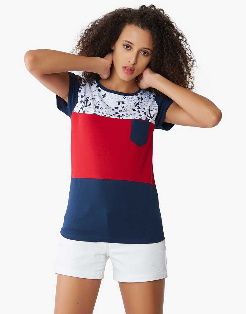 Printed Women's Round Neck White, Red, Dark Blue T-Shirt